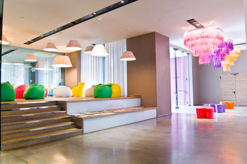 "A large industrial building transformed in a design hotel. Urban signs like graffiti and one-off pieces by artists and designers melt in the flexible public and private spaces.”